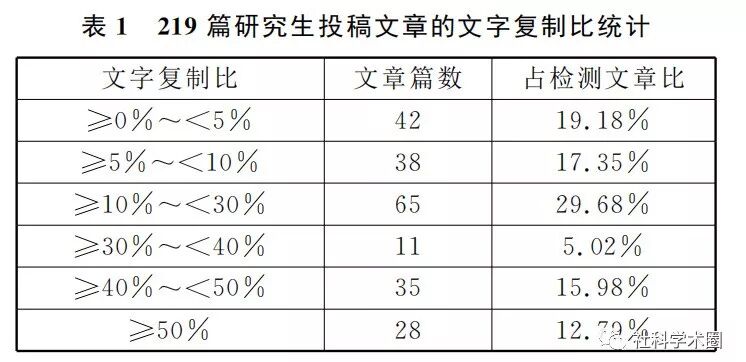 参考文献是为编撰论著而引用的有关文献信息资源,主要包括图书、连续出版物、电子文献、学位论文、论文集、会议录、科技报告、专利文献等。参考文献是研究生撰写学术论文不可或缺的组成部分,从公开出版物到非公开出版物、从纸质文献到电子文献可谓无所不包,研究表明,博士、硕士已发表文章篇均参考文献分别为11.96篇、6.56篇。同时,参考文献使用不当也会造成过高的文字复制比。笔者使用中国知网“科技期刊学术不端文献检测系统(AMLC)”、“社科期刊学术不端文献检测系统(SMLC)”对某地方高校学报2012年度共6期219篇研究生独撰或以第一作者来稿的文章进行文字复制比检测,统计结果如表1所示。注:本表中,因硕、博士研究生投稿数量及其学科专业分布差异较大,故未分类统计。根据上述学术不端文献检测系统规定的学术不端行为诊察量化数字规则: