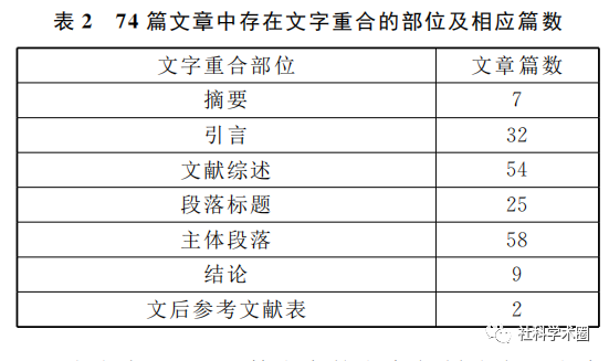 学术期刊一般都以文字复制比≥30%为参照线来初步判断是否存在抄袭等学术不端行为,并确定是否退稿。按此标准,表1中文字复制比≥30%的文章为74篇,占检测文章总数的33.79%,表明投往该刊的研究生学术论文中超过1/3文字复制比较高。上述重复文字比例中,系统规定文字复制比≥10%的文字重合部分为抄袭,并以10%、30%、50%为界点,将其划分为轻度句子抄袭、句子抄袭、轻度段落抄袭、段落抄袭和整体抄袭5种情况。通过对74篇文字复制比较高文章的进一步分析,发现存在着不同程度的抄袭。其中,40%≤文字复制比<50%的35篇文章存在着多处段落抄袭,文字复制比≥50%的2篇文章多为整体抄袭。段落抄袭一般是某段或若干段中全部或大多数文字连续出现与比对文献中的文字重复。整篇抄袭指作者文章的大部分内容抄自一篇或多篇文章。段落抄袭和整篇抄袭属于最严重的两种抄袭行为,通常判定为学术不端。上述论文抄袭的主要内容有他人或本人受著作权保护文献中的论点、论据、论证方法、表格数据、图像图形、概念、引言等,其主要原因在于失当、违规或非法的“引用”。通过对74篇高文字复制比文章的统计,文字重合部分及其文章数量分布如表2所示:由上表可见,74篇文章的文字复制分布于文章的摘要、引言、文献综述、段落标题、主体段落、结论、文后参考文献表等部位,以“引言”、“文献综述”、“主体段落”和“段落标题”部分重复为主,以作为文章核心部分的“段落标题”和“主体段落”的文字复制比过高影响最明显、后果最严重。将上述文章重合文字中的合理引证予以适当取舍保留后,发现仍有相当高的文字复制比,这是由于作者参考文献引用过多、引用不加标识、引用未予著录以及大量照抄它文观点和数据等所致。因此,合理引用成为有效规避学术不端行为的重要措施。参考文献的合理引用包括内容的恰当引用、文中的合理标识、文末的正确著录等三个方面。参考文献具有提示研究起点、知识承续、鸣谢归誉、学术评价、预测分析、文献检索、学术论证、著作权保护、学术规范、节约篇幅版面等十项功能,其内容的不合理使用是造成高文字复制比的主要原因之一,科学引用因而成为文献参考的关键。首先,选择合适的参考文献类型。学术不端文献检测是将被检测文献与检测系统收录文献进行比对,找出文字重复部分,再作抄袭等鉴定。中国知网等学术不端文献检测系统的比对文献源涵盖了学术期刊、优秀硕博士论文等多种类型的文献。检测显示,引文出自公开出版物且在文中明确标识、文后正确著录的,被检测出的重复文字判为抄袭的相对较少,而引文来自非正式出版物、网上文献、转引等,被检测出的文字复制比明显增高,且多判为“抄袭”。因此,(1)应优先引用公开出版的、收录于检测系统比对源的文献。(2)慎引图书和外文文献内容。因为检测比对源尚未收录书籍和多数外文文献,引用此类文献难以被检测出来而判为与其它相关引证文献文字重复,必要的引用应附上引文原件或复印件,以备核查。(3)尽量不选择博客、电子公告等网络资源和转引文献。尽管学术不端系统开始注意收录网络文献,但多数博客、电子公告等网上文献不属于公开出版物,正确性和科学性难以保证,易于因乱引、谬引而产生文字重复。第二,选择适量的参考文献。检测表明,引文越多,产生的文字复制比也越高,因此引文量必须控制。对此,学术期刊一般不作硬性规定,但多要求必须有一定的参考文献。根据已有研究成果及经验,一般的基础研究、理论研究论文引用的参考文献数量在10篇左右,综述性论文引用的文献数量可以多一些,技术性、实验性论文引用文献相对较少。参考文献的选择,应该根据文章的需要来确定,以数量最少、质量最优、作用最佳、成果最新为基本原则。杜绝友情互引、标榜式自引、应和刊物要求的强制性引用等非必要引用,充分保证引文质量与数量达到最优化状态,最大程度地降低因引文量失当而产生的文字复制比。第三,突出引文的论证作用。参考文献的主要作用在于引证,即:使用其论题、观点、概念、理论、方法、结果、结论、事实、数据等为本人论文的创新性、科学性和应用价值提供必要的论证依据。单纯堆砌与拼接引用文字、过度引用、抄袭、无效引用、错误引用等非合理引证易于造成高文字复制比。为此,使用参考文献时,必须明确区分并妥善处理用于引证的和仅供参考的文献。引证主要用于:作为选题背景,以确定本文的研究范围;作为本文的论题,对已有研究成果进行补充完善,以求深化与提高;作为反论题,指出其缺陷与错误,予以批驳和推翻,以便提出新的观点、理论和方法;作为论据,为自己的创新提供佐证。引证时,应视具体需要采用指示性引用、直接性引用、概括性引用。例如:撰写《专业学位研究生教育及其职业资格认证》需参考文献[10],相应的引用方式分别为:②“专业学位研究生教育与职业资格认证衔接的主要问题”有:“与职业资格认证发展相比,专业学位研究生教育发展的速度依旧滞后;……”[10];③专业学位研究生教育与职业资格认证衔接存在的主要问题是学位教育发展速度滞后、管理制度存在障碍、衔接机制建设不力。这三种引用造成的文字复制量为②>③>①,直接性引文量必须严加控制。参考文献